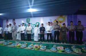 Ustaz Das'ad Latif bersama Bupati Kutim Ardiansyah Sulaiman dikerumuni warga Teluk Pandan dalam momen Halal Bihalal Pemerintah Desa Teluk Pandan.Foto: Irfan/Pro Kutim