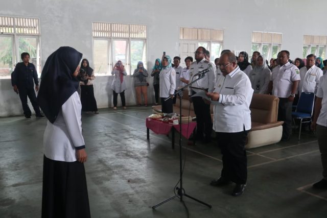 Bupati Kutim H Ismunandar saat mengukuhkan Rosliani sebagai Pejabat Sementara (Pjs) Kepala Desa Pinang Raya di Gedung BPU Kantor Desa Sangatta Selatan, Rabu (16/01/2019). (Humas)
