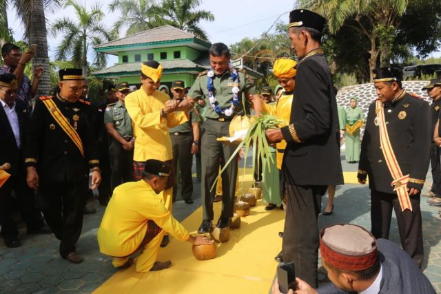 Danrem 091/ASN Brigjen TNI Widi Prasetijono Ketua Persit Kartika Chandra Kirana Koorcab Rem/091 Novita Permatasari Widi Prasetijono disambut dengan tradisi tepung tawar (adat Kutai), di Halaman Makodim 0909/Sangatta (Foto: Wak Hedir Humas Kutim)