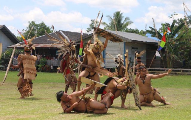 Himpunan Pemuda Pelestari Seni dan Budaya (HP2SB) Desa Miau Baru Pukau Asisten Pemkesra Kutim Suko Bouno, Kadis Kebudayaan Yusuf Samuel, Camat Kongbeng Furkani, Camat Muara Wahau Irang Ajang, Tokoh Adat dan Tokoh Masyarakat Desa Miau Baru dan tamu undangan lainnya dengan Tarian Hifan Pakan dan Hifau Sau . (Foto: Wak Hedir Humas)