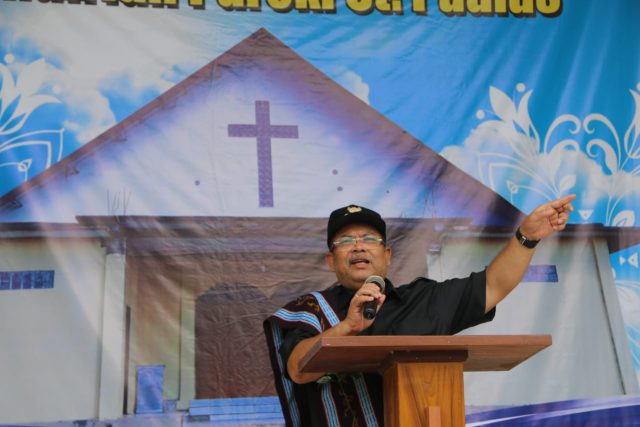 Ismunandar saat berikan sambutan menyapa jamaat paroki santo paulus.(foto: Wahyu Humas)