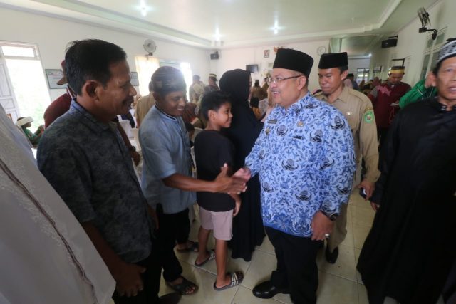 Suasana hangat Bupati Ismunandar menyalami para warga saat menghadiri peringatan Maulid Nabi Muhammad SAW 1441 H di Kantor Desa Spaso Barat, Kecamatan Bengalon. (Foto: Jani Humas)