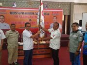 Kasmidi Bulang menerima bendera IOF Kutim setelah terpilih secara aklamasi sebagai ketua IOF Kutim priode 2019-2023. (Foto ist)