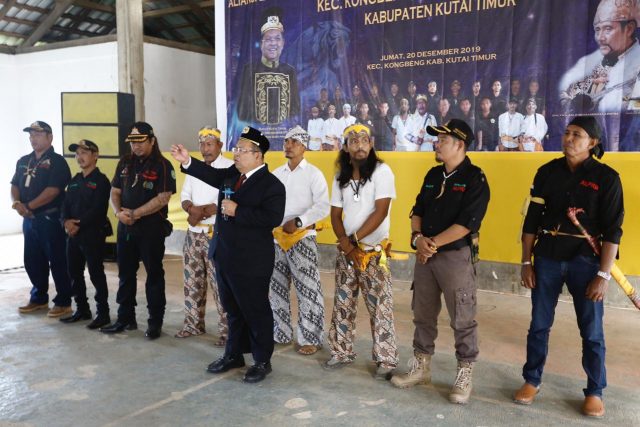 KONGBENG-Bupati Kutai Timur (Kutim) Ismunandar bergelar Pangeran Sura Praja mengukuhkan Kepengurusan Dewan Pimpinan Cabang (DPC) Kecamatan Kongbeng dan Pimpinan Anak Cabang (PAC) Kecamatan Muara Wahau dan Telen Aliansi Laskar Pemuda Kutai Bersatu (ALPKB) dan Detasemen Remaong Koetai (DRK) di Gedung BPU Desa Makmur Jaya SP 3 Kecamatan Kongbeng sekitar pukul 16.30 Wita, Jumat (20/12/2019).