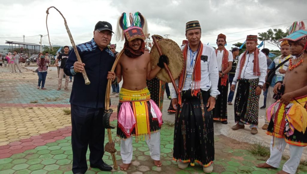 Sekkab Kutim H Irawansyah berkesempatan untuk melakukan Paki Reis (pukulan pertama) pertama pada pembukaan seni tari caci. (Wak Hedir Pro Kutim)