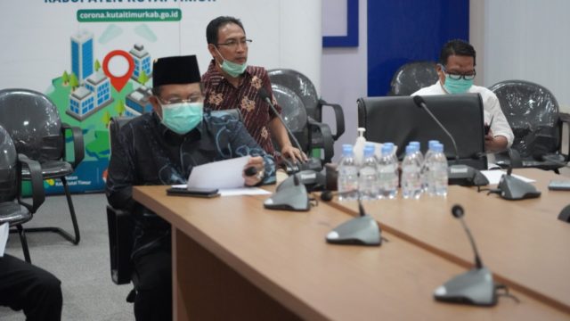Bupati Ismunandar saat melakukan video teleconference bersama pihak perusahaan terkait di Ruang Diskominfoperstik Kutim. (Wahyu Yuli Artanto Pro Kutim)