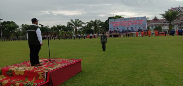 Bupati Kutim H Ismunandar bertindak sebagai inspektur upacara pada apel penerapan Tatanan Normal Baru (New Normal) serta siaga kebakaran hutan dan lahan di wilayah Kutim di Lapangan Helipad, Kawasan Perkantoran Pemkab Kutim. (Wak Hedir Pro Kutim)