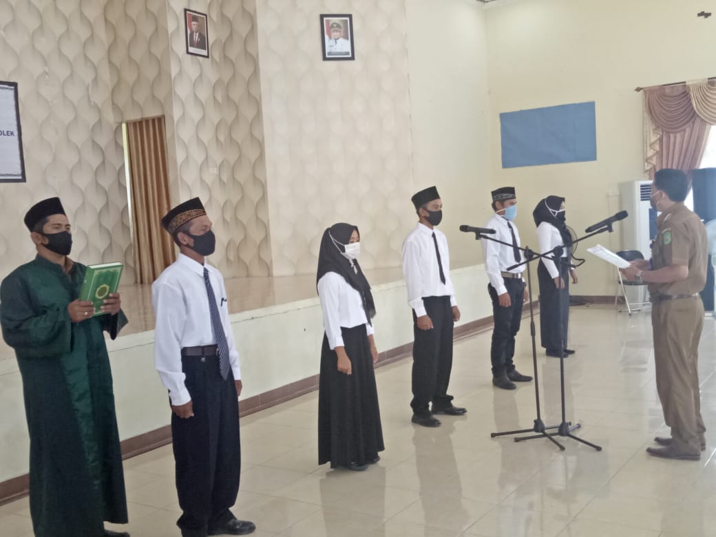 Lima orang pengurus BPD Kolek, kecamatan Sangkulirang ketika dikukuhkan oleh Camat Sangkulirang Rahmad, dan tetap mengikuti protokol kesehatan dalam prosesi pelantikan tersebut. (ist)