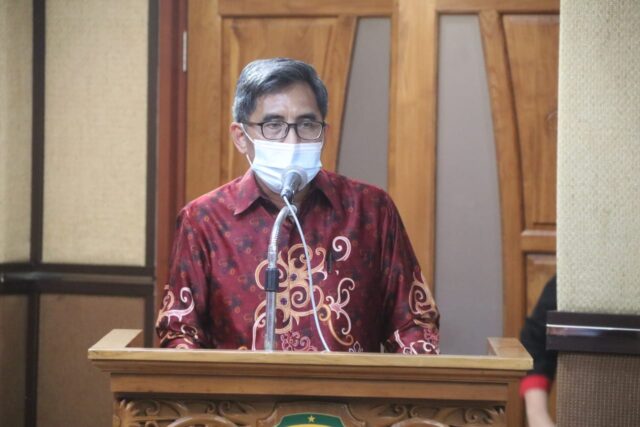 Pjs Bupati Kutim Moh Jauhar Efendi memberikan sambutan di malam ramah tamah dan penyerahan piagam penghargaan TK Provinsi Kaltim, yang dihelat di ruang Tempudau, Kantor Bupati, Selasa malam (3/11/2020).(Wak Hedir Pro Kutim)
