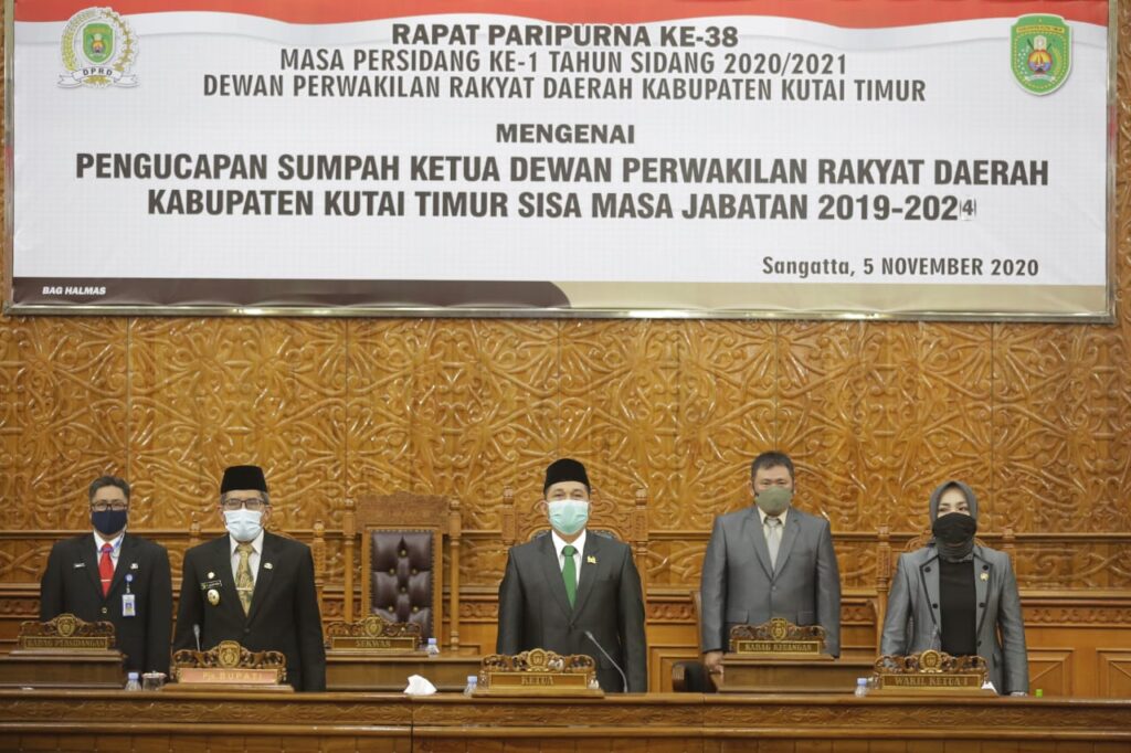 Kegiatan Pengucapan Sumpah Ketua DPRD Kutim Sisa Masa Jabatan 2019-2024 pada Rapat Paripurna Ke-38 masa persidangan ke-1 tahun 2020 digelar di Ruang Sidang Paripurna, Gedung DPRD Kutim, Kamis (5/11/2020). Joni diambil sumpah oleh Ketua Pengadilan Negeri (PN) Sangatta Rahmat Sanjaya diampingi rohaniawan disaksikan para undangan yang hadir.