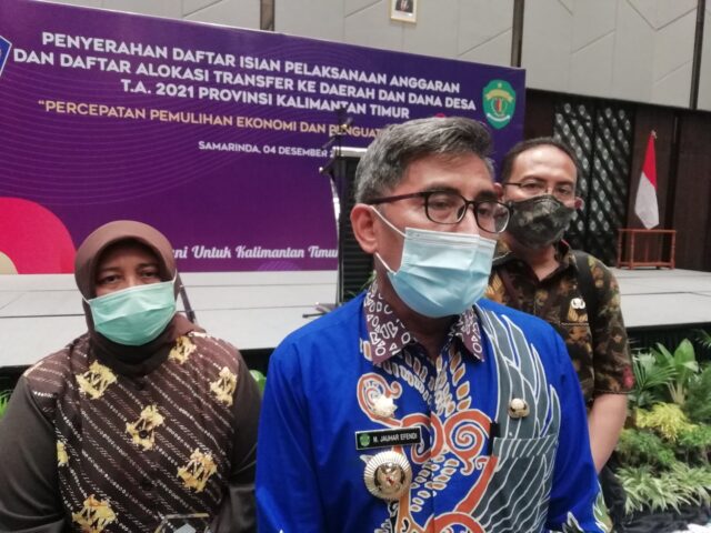 Pjs Bupati Kutim Moh Jauhar Efendi diwawancara usai menerima DIPA dan DD yang diserahkan Gubernur Kaltim Isran Noor. (Wahyu Pro Kutim)