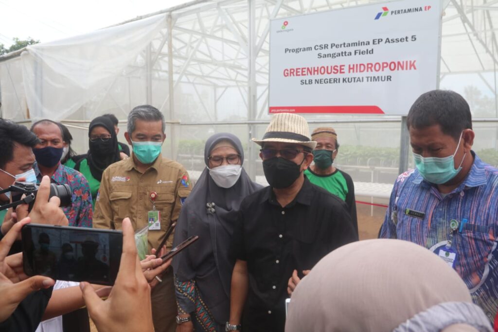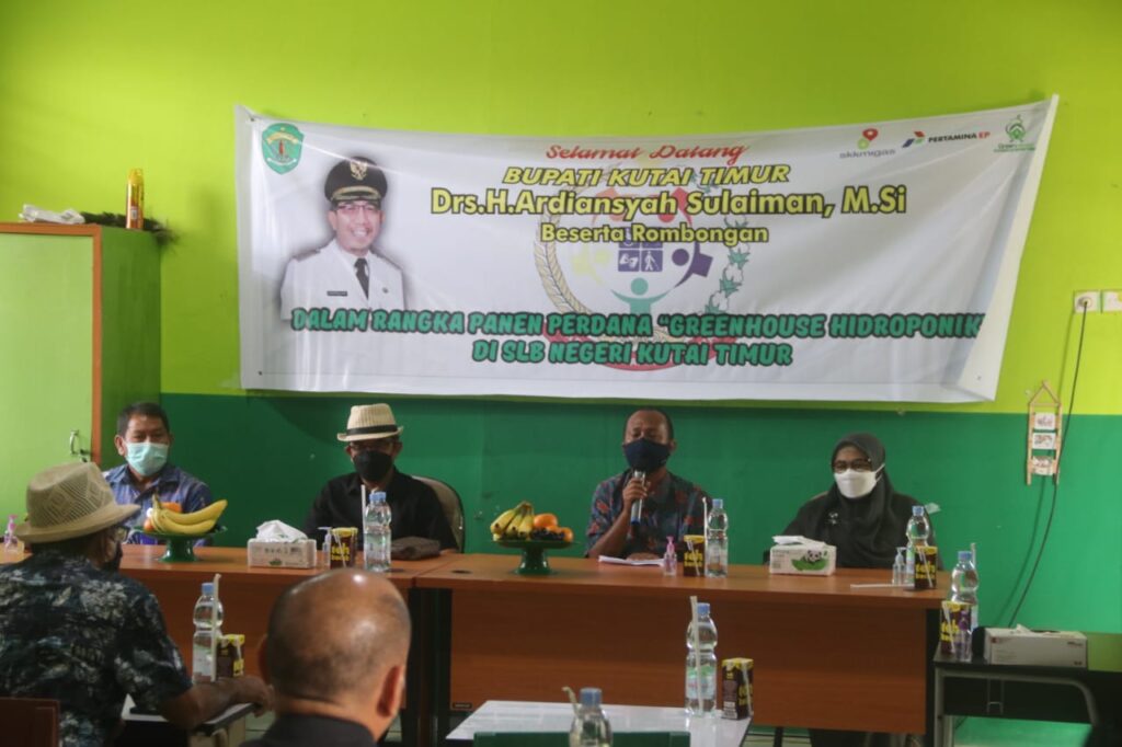 SANGATTA – Pada Sabtu (6/3/2021) pagi, Bupati Kutai Timur (Kutim) Ardiansyah Sulaiman melakukan kunjungan kerja ke Sekolah Luar Biasa (SLB) Negeri Kutim. Kunjungan kerja itu untuk ikut melakukan panen perdana selada dan pakcoy di Green House Hidroponik milik SLB Negeri Kutim hasil garapan perusahaan plat merah yakni PT Pertamina EP Sangatta Field.