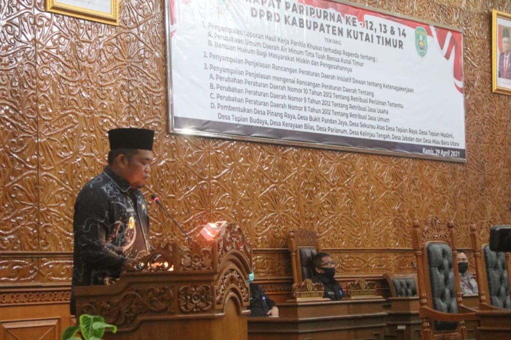 SANGATTA – Setelah melalui proses beberapa waktu, akhirnya Rancangan Peraturan Daerah (Raperda) Perusahaan Umum Daerah (Perumda) Air Minum Tirta Tuah Benua Kutai Timur (TTBK) untuk menjadi Peraturan Daerah (Perda), disetujui oleh Dewan Perwakilan Rakyat Daerah (DPRD) Kutim. Persetujuan DPRD itu disampaikan dalam Rapat Paripurna ke 12 DPRD Kutim yang dipimpin langsung oleh Wakil Ketua 2 DPRD Kutim Arfan, diruang sidang utama Sekretariat DPRD Kutim, Kamis (29/4/2021).