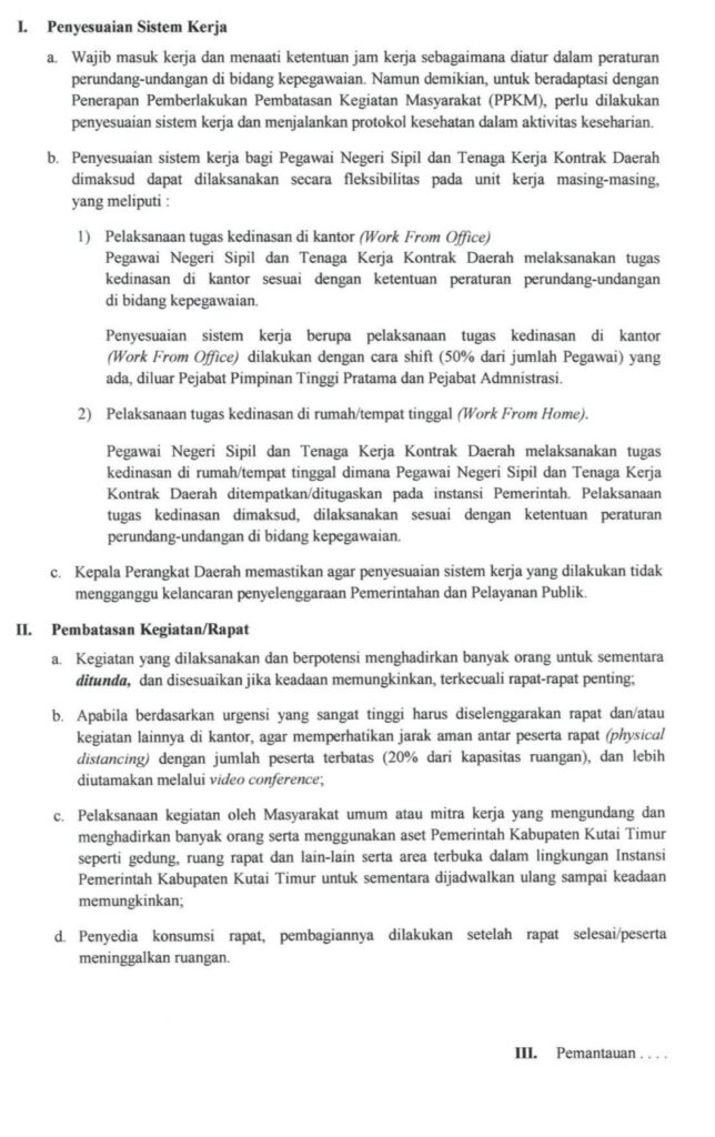 “Untuk WFO, ASN dan TK2D wajib masuk kerja dan menaati ketentuan jam kerja sebagaimana diatur dalam peraturan perundang-undangan. Namun demikian untuk beradaptasi dengan PPKM perlu dilakukan penyesuaian jam kerja dan menerapkan protokol kesehatan (prokes) dalam aktivitas keseharian,” ucap Ardiansyah dalam poin surat tersebut.