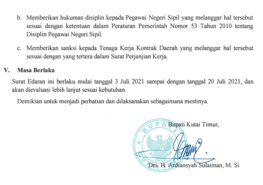 SANGATTA – Bupati Kutai Timur (Kutim) Ardiansyah Sulaiman menandatangani surat edaran resmi bernomor 060/778/ORG.II tertanggal 9 Juli 2021 terkait penyesuaian jam kerja ASN dan TK2D di lingkungan Pemkab Kutim. Hal ini seiring mengikuti instruksi pusat dalam masa Pemberlakuan Pembatasan Kegiatan Masyarakat (PPKM) mulai 3 – 20 Juli 2021.