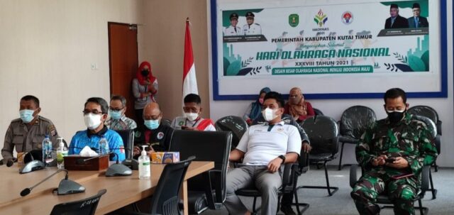 SANGATTA – Bupati Kutai Timur (Kutim) Ardiansyah Sulaiman menghadiri puncak peringatan Hari Olahraga Nasional (Haornas) ke XXXVIII tahun 2021 tersebut secara virtual di Ruang Media Center Diskominfo Perstik Kutim, Kamis (09/09/2021). Turut hadir Ketua DPRD Kutim Joni,S.Sos, Kadispora Basrie, Plt. Kadis Kominfo Perstik Ronny Bonar Siburian, Danlanal Sangatta Letkol Laut (P) I Komang Nurhadi, Pasiter Kodim Kapten Inf Arif Safardiyatno, Ketua KONI Kutim Heri Masdar dan steakholder lainnya.