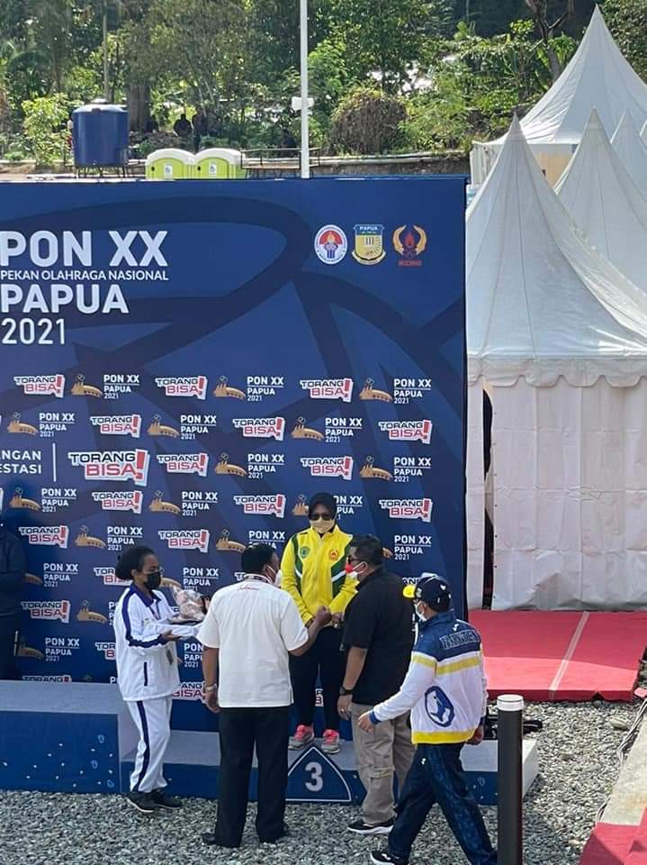 Momen penyerahan medali perunggu yang diraih Kayla Adinda Utomo di cabor panahan PON XX Papua 2021. Foto: ist