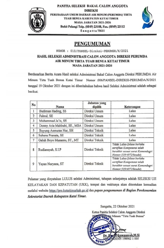 “Berdasarkan berita acara hasil seleksi administrasi bakal calon anggota Direksi Perumda Air Minum Tirta Tuah Benua Kutai Timur, Nomor : 006/PANSEL-DIREKSI-PERUMDA/X/2021/tanggal 19 Oktober 2021 dengan ini diberitahukan bahwa hasil seleksi administrasi yang memenuhi syarat (7 orang) ,” tulisnya dalam pengumuman tersebut.