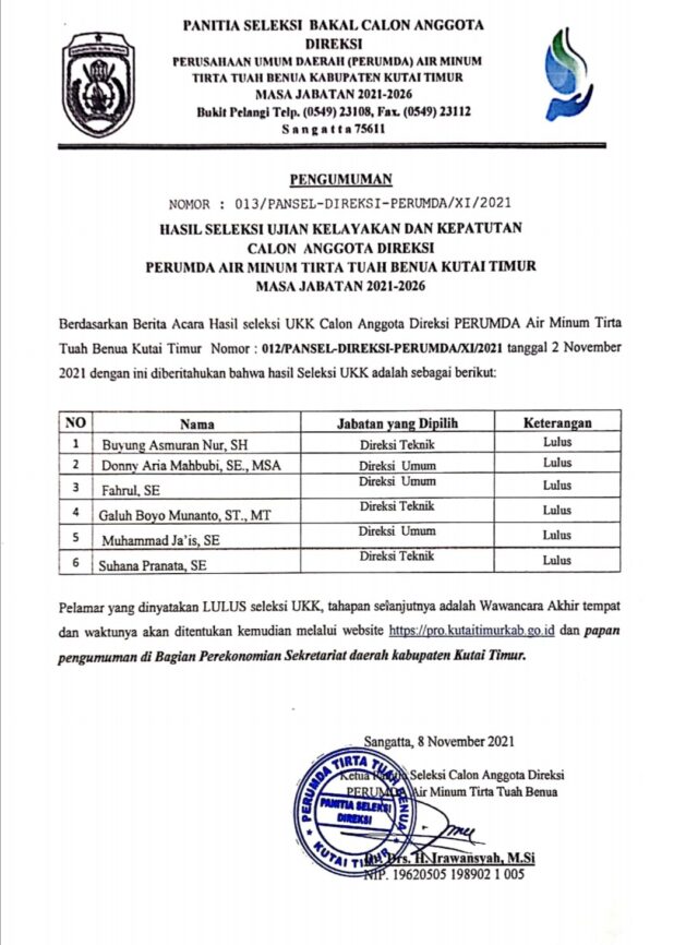 “Berdasarkan berita acara hasil seleksi UKK Calon Anggota Direksi Perumda Air Minum Tirta Tuah Benua Kutai Timur, Nomor: 12/PANSEL-DIREKSI-PERUMDA/XI/2021 tanggal 2 November 2021 dengan ini diberitahukan bahwa hasil seleksi UKK yang lulus (6 orang),” demikian isi dalam pengumuman tersebut.