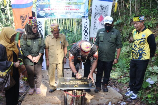 Momen Wabup Kutim Kasmidi Bulang dalam peresmian tangga di Air Terjun Embang Lemun. Foto: ist