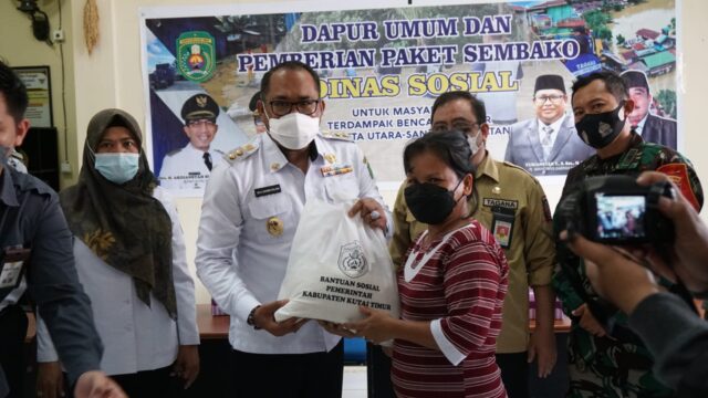 Momen saat Wakil Bupati Kutim Kasmidi Bulang memberikan bantuan secara simbolis kepada warga yang terdampak banjir. Foto: ist