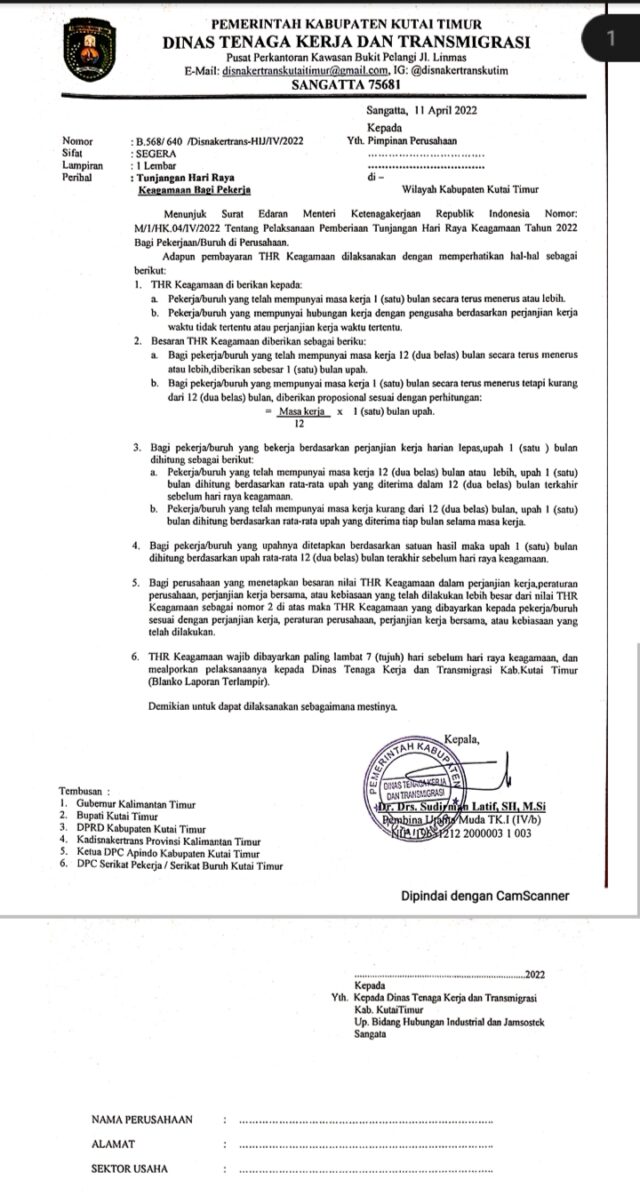 SANGATTA – Dinas Tenaga Kerja dan Transmigrasi (Disnakertrans) Kutim mengeluarkan surat edaran per 11 April 2022 bernomor B.568/640/Disnakertrans-HIJ/IV/2022 yang ditujukan untuk seluruh pemimpin perusahaan yang ada di kecamatan Kutim. Surat dimaksud ditandatangani oleh Kepala Disnakertrans Kutim Sudirman Latif. Perihal ini terkait merunjuk surat edaran dari Menteri Ketenagakerjaan RI Nomor M/1/HK.04/IV/2022 tentang Pelaksanaan Pemberian Tunjangan Hari Raya (THR) Keagamaan Tahun 2022 bagi pekerja/buruh di perusahaan.