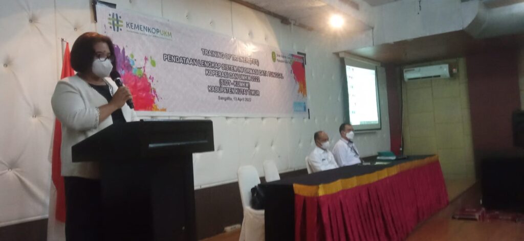 SANGATTA- Untuk mencetak para enumerator usaha dan usaha mikro kecil dan menengah (UMKM), yaitu petugas lapangan yang melakukan pengumpulan data pelaku UMKM se Kabupaten Kutai Timur (Kutim), Dinas Koperasi dan Usaha Kecil Menengah (Diskop UKM) Kutim menggelar Pelatihan Pendataan Lengkap Sistem Informasi Data Tunggal Koperasi dan UMKM (SIDT-KUMKM). Pelatihan yang dilaksanakan dengan menggandeng Badan Pusat Statistik (BPS) ini dibuka oleh Staf Ahli Bupati Kutim Bidang Administrasi Umum dan HAM, Roma Malau, di Hotel Royal Victoria, Rabu (13/4/2022).