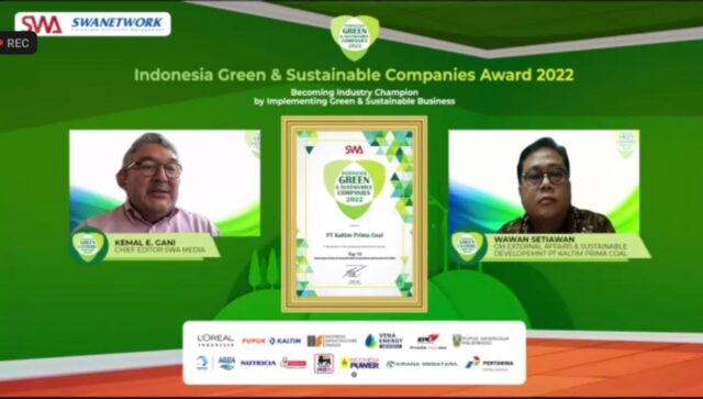 SANGATTA- Konsistensi perusahaan dalam implementasi prinsip-prinsip triple bottom line (people, profit, planet) yang diterapkan PT Kaltim Prima Coal (KPC) kembali membuat perusahaan ini meraih penghargaan. Penghargaan kali ini diberikan oleh Majalah SWA. Penghargaan diberikan secara virtual oleh Chief Editor SWA Group Kemal E Gani dan diterima General Manager External Affairs and Sustainable Development (GM ESD) KPC Wawan Setiawan, Kamis (12/5/2022).