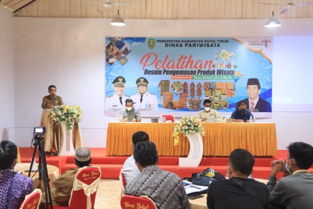 SANGATTA- Sebagai upaya peningkatan sumber daya kepariwisataan serta ekonomi kreatif, Dinas Pariwisata Kabupaten Kutai Timur (Dispar Kutim) menggelar Pelatihan Pengemasan Desain Produk Wisata dan Workshop Pengembangan SDM dan Penguatan Kelembagaan Pokdarwis/ Desa Wisata. Pelatihan dimaksud dibuka Bupati H Ardiansyah Sulaiman, di Cafe Teras Belad, Selasa (31/5/2022).