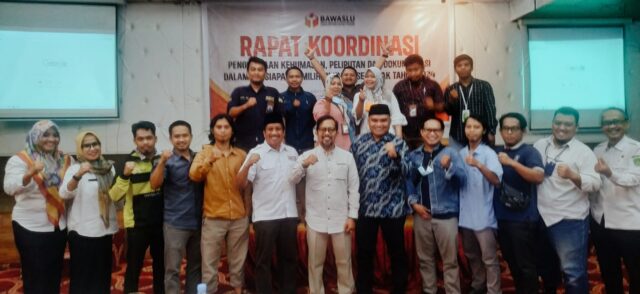 Bawaslu Kutim melakukan foto bareng bersama-sama dengan para wartawan usai kegiatan rakor (Foto Ronall J Warsa Pro Kutim)
