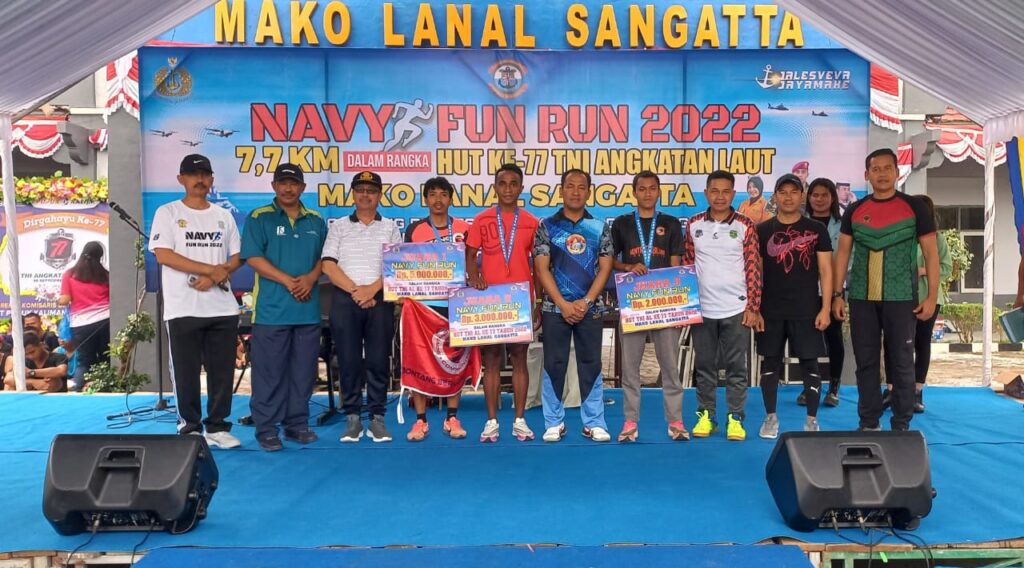 SANGATTA – HUT ke-77 TNI AL, Lanal Sangatta menggelar event Navy Fun Run. Acara yang dihadiri unsur Forkopimda serta Asisten I Pemkesra Poniso Suryo Renggono mewakili Bupati Kutai Timur (Kutim) ini berlangsung meriah.