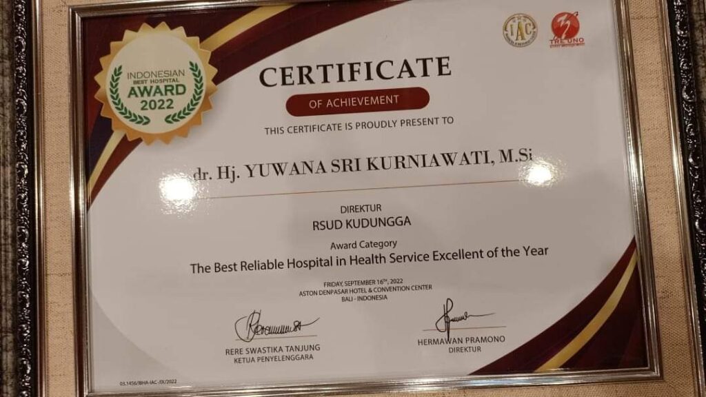Dalam hal ini, Direktur Rumah Sakit Umum Daerah (RSUD) Kudungga Kabupaten Kutai Timur (Kutim) Yuwana Sri Kurniawati baru saja secara simbolis menerima penghargaan The Best Reliable Hospital In Health Service Excellent Of The Year yang berlangsung di Ballroom Hotel Aston Denpasar, Bali, Jumat (16/9/2022) lalu.