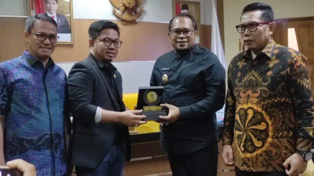 Momen M Nasiruddin yang didampingi Agus Aras dan Ismail saat memberikan cinderamata kepada Wabup Kasmidi Bulang. Foto: Istimewa