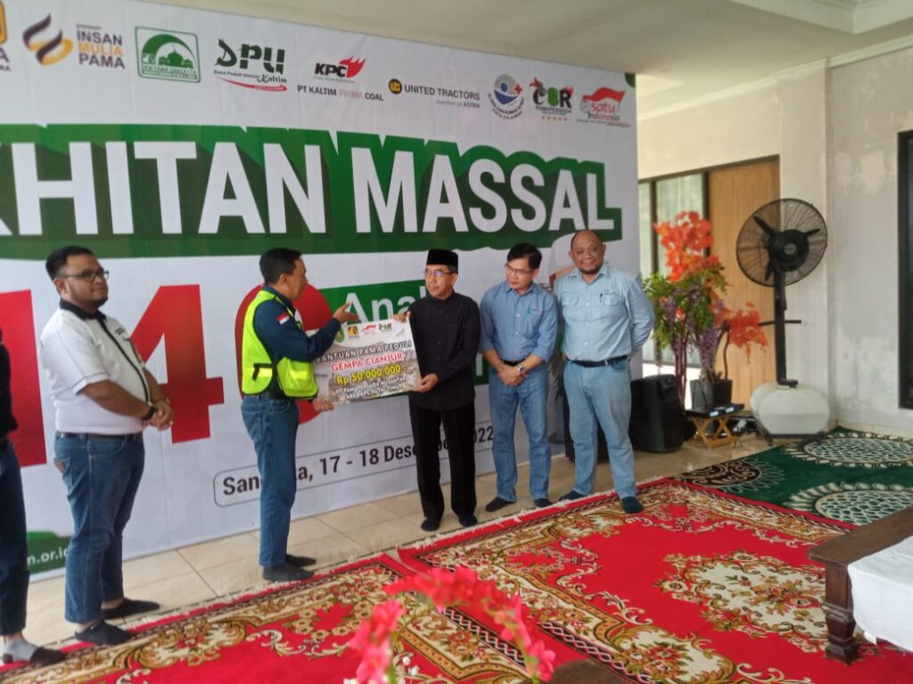 Pada kesempatan itu, Ardiansyah juga memberikan paket bingkisan kepada perwakilan anak yang di khitan. Serta menerima secara simbolis bantuan gempa Cianjur oleh PT Pama sebesar Rp 50 juta dan PT KPC sebesar Rp 75 juta. Dijelaskan Bupati bahwa dana bantuan untuk korban gempa Cianjur sudah mencapai miliaran rupiah.