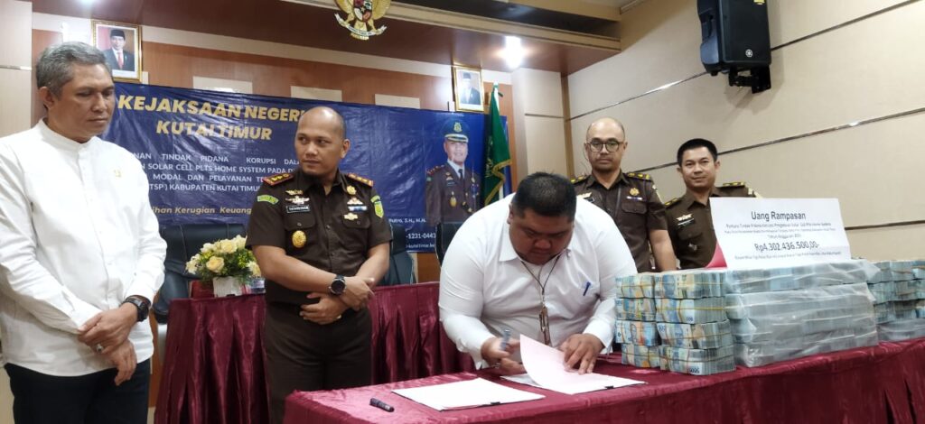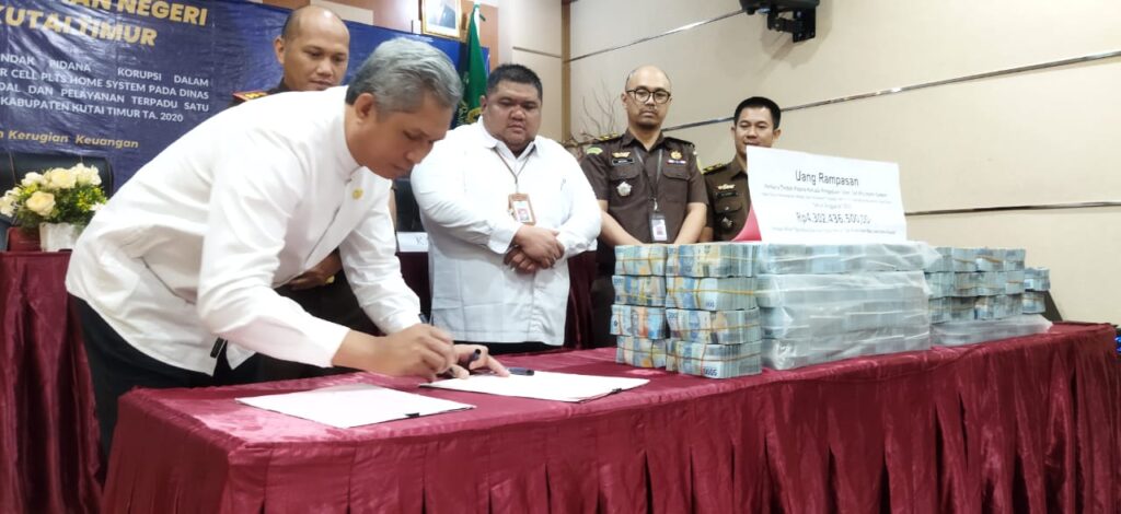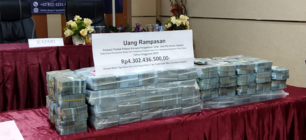 “Perkara ini sudah berkekuatan hukum tetap dan Kejari Kutim melakukan penyerahan uang rampasan perkara Tipikor Pengadaan Solar Cell Pits Home System pada Dinas Penanaman Modal dan Pelayanan Terpadu Satu Pintu Kutim Tahun Anggaran 2020 ke kas daerah Kutim berupa uang tunai sebesar Rp 4.302.436.500,00,” jelasnya.