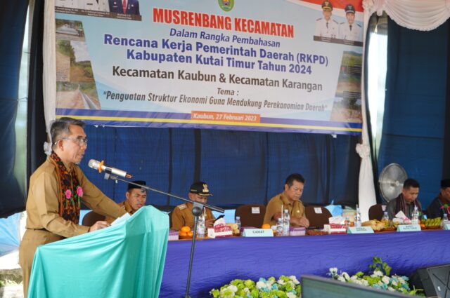 KAUBUN – Musrenbangcam Kaubun dan Karangan yang dipusatkan di Gedung BPU Desa Bumi Etam, Senin (27/2/2022) memfokuskan sejumlah perencanaan pembangunan. Dalam kesempatan itu, kegiatan langsung dibuka oleh Bupati Kutim Ardiansyah Sulaiman didampingi Ketua DPRD Kutim Joni, Wakil Ketua II DPRD Kutim Arfan, Kepala Bappeda Kutim Noviari Noor dan sejumlah perwakilan Kepala OPD terkait, anggota DPRD Kutim, camat, kepala desa, perwakilan perusahaan dan sejumlah masyarakat.