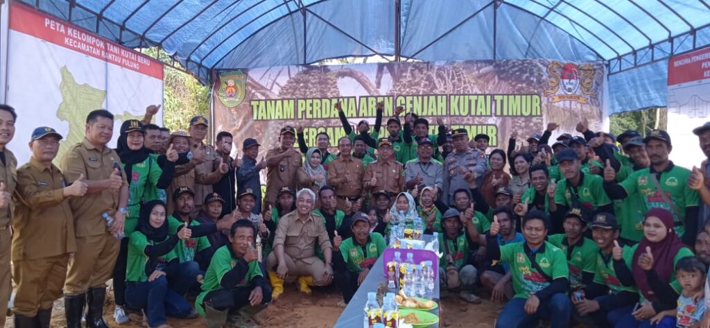 RANPUL – Tanam perdana bibit aren genjah bersama Bupati Kutai Timur Ardiansyah Sulaiman, Forkopimda dan Kelompok Tani (Poktan) Kutai Benu Desa Rantau Makmur digelar di Desa Rantau Makmur Kecamatan Rantau Pulung (Ranpul), Senin (13/3/2023).