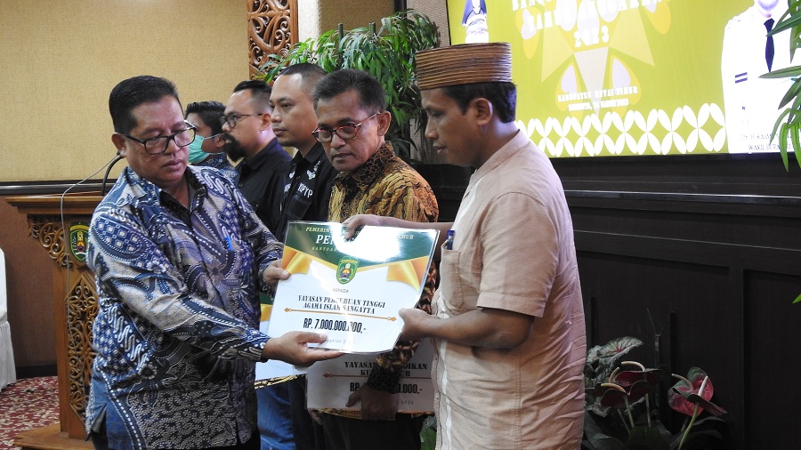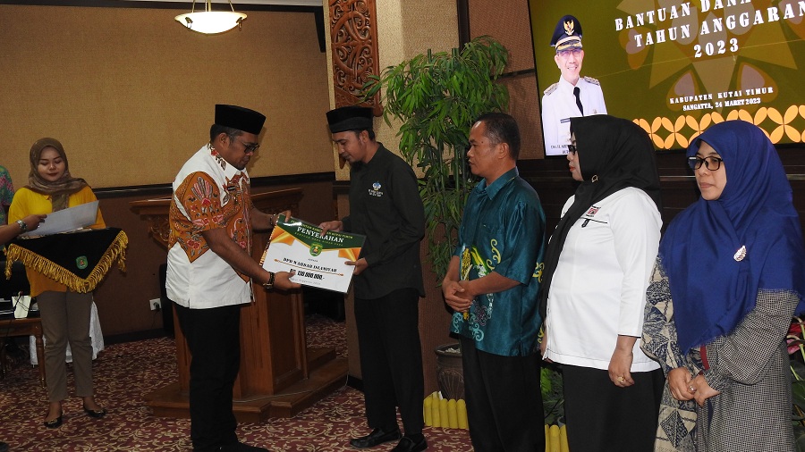 Penyerahan kepada lima penerima dana hibah oleh Kabag Kesra Kutim Sahman untuk Ketua Paguyuban Kesjaranan Borneo Putro Legowo sebesar Rp100 juta, Ketua Yayasan Lamin Dayak Sangatta Rp 650 juta, Ketua Yayasan Lentera Peduli Yatim Piatu Kutim Rp 200 juta, Ketua Yayasan Pendidikan Kutai Timur (YPKT) Rp 9 miliar dan Ketua Yayasan Perguruan Tinggi Sangatta (YPSTAIS) Rp 7 miliar. (kopi8/kopi3)