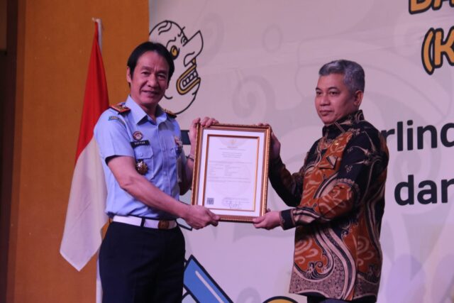 Asisten Ekbang Seskab Kutim Zubair mewakili Pemkab Kutim menerima piagam sertifikat KIK dari Kanwil Kemenkumham Kaltim. Foto: istimewa
