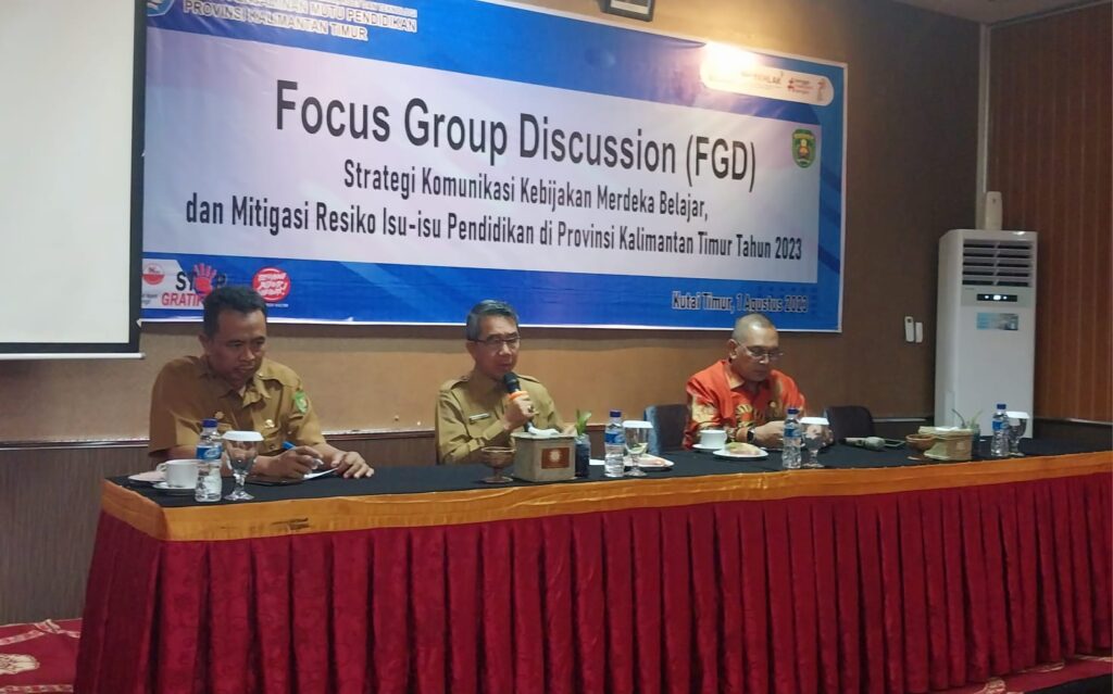 SANGATTA – Balai Penjamin Mutu Pendidikan (BPMP) Provinsi Kalimantan Timur (Kaltim) bekerja sama dengan Dinas Pendidikan dan Kebudayaan (Disdikbud) Kabupaten Kutai Timur (Kutim) menggelar Focus Group Discussion (FGD). Mengangkat tema “Strategi Komunikasi Kebijakan Merdeka Belajar dan Mitigasi Resiko Isu-isu Pendidikan di Provinsi Kaltim Tahun 2023. FGD dibuka langsung oleh Bupati Ardiansyah Sulaiman di Pelangi Room Hotel Royal Victoria Sangatta, Selasa (1/8/2023) pagi.