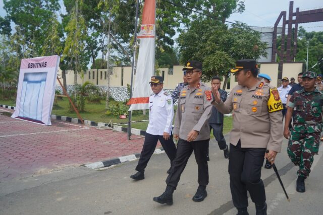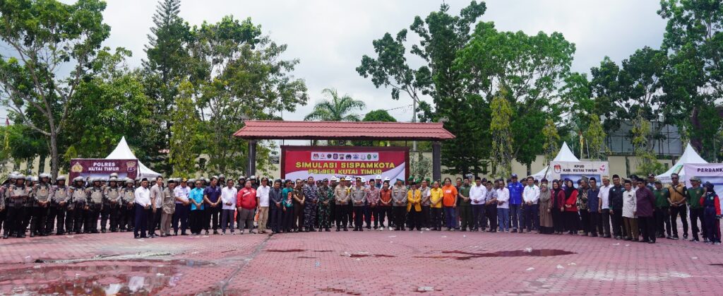 SANGATTA – Menyambut tahun politik tahun 2024, jajaran Polres Kutim menggelar Simulasi Sistem Pengamanan Kota (Sispamkota) yang dilaksanakan di area halaman Lapangan Mako Polres Kutim, Rabu (27/9/2023). Kegiatan ini turut dirangkai dengan peragaan simulasi Tactical Floor Game (TFG), dan Deklarasi Pemilu Damai 2024. Hadir Wakapolda Kaltim Brigjen Pol Mujiyono, Bupati Kutim Ardiansyah Sulaiman, Kapolres Kutim AKBP Ronni Boni, jajaran Forkopimda hingga jajaran instansi terkait.