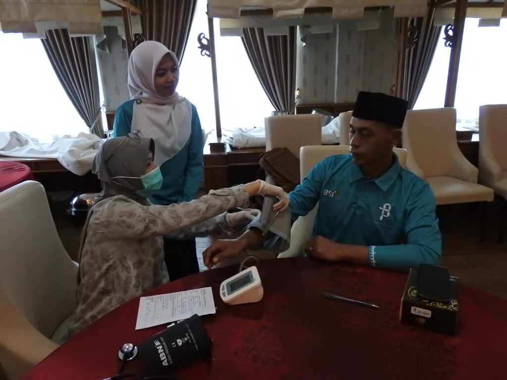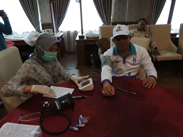 dr Andi Amraini, Kepala UP PMI Kutim memeriksa Samsuddin Sennang dari Bagian Kesra Setkab Kutim dalam kegiatan gelar donor darah HAB Kemenag. Foto: Adi Sagaria/Pro Kutim