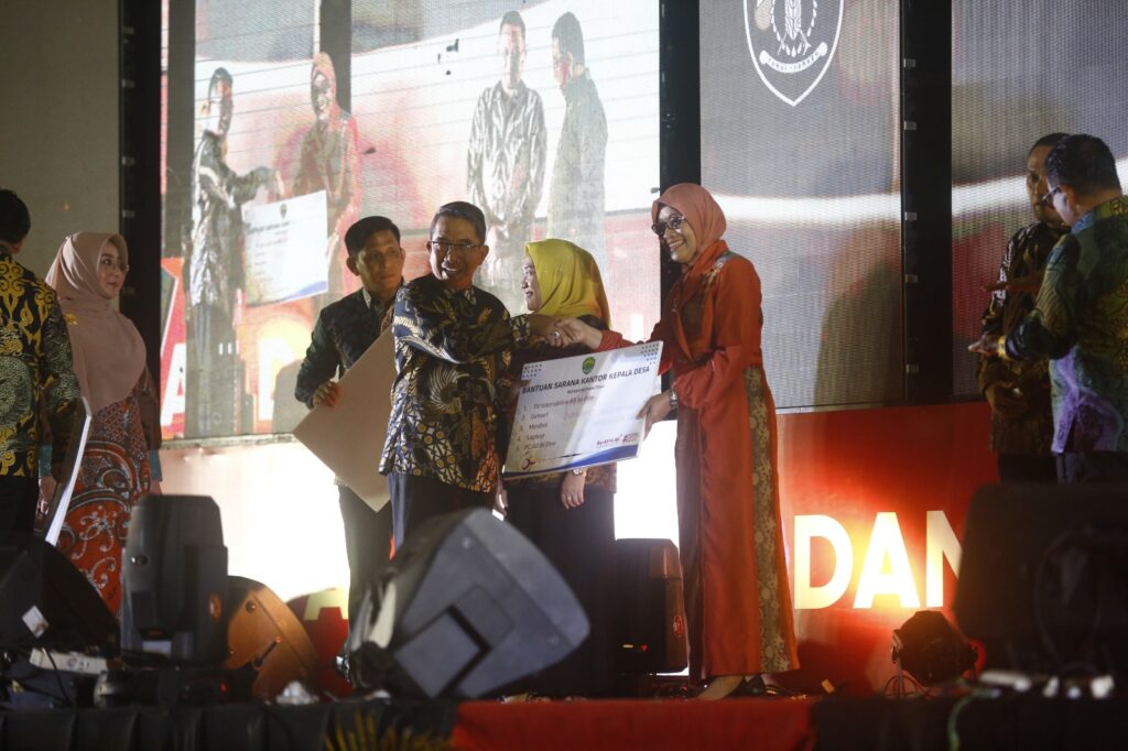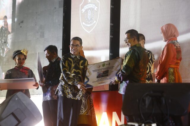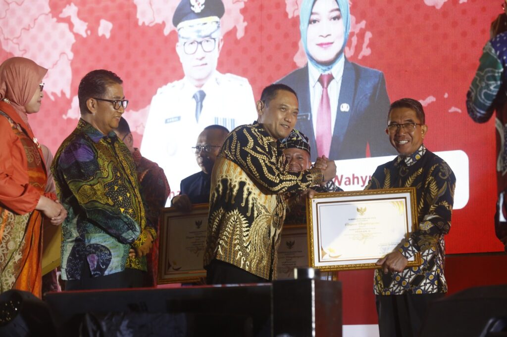 Momen Gubernur Kaltim Akmal Malik menyerahkan penghargaan kepada Bupati Kutim Ardiansyah Sulaiman di Convention Hall Samarinda. Foto: Vian Pro Kutim