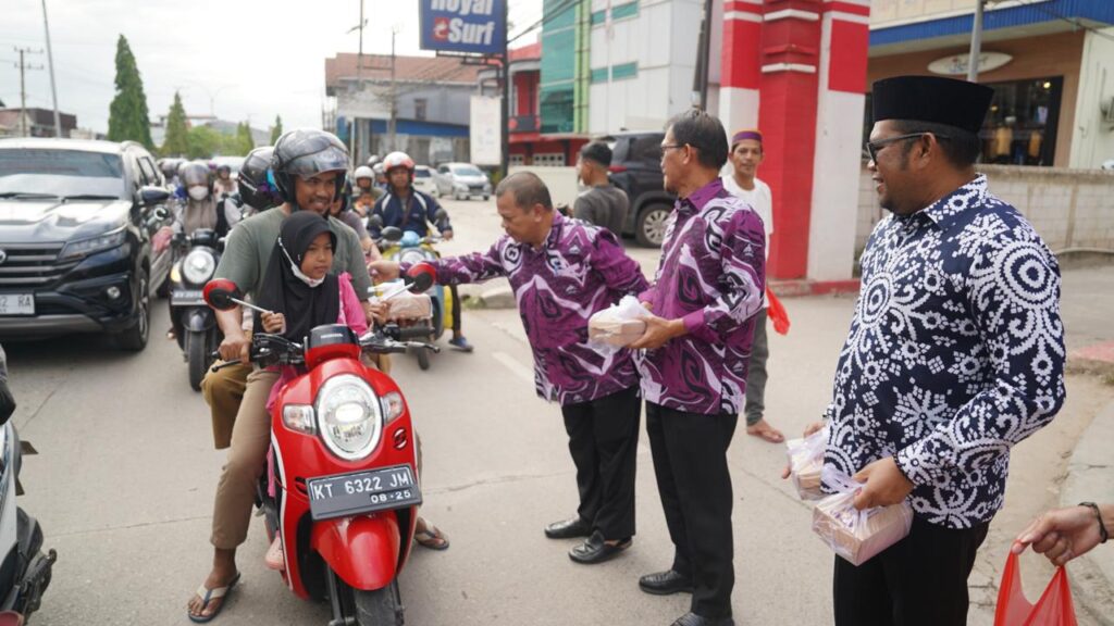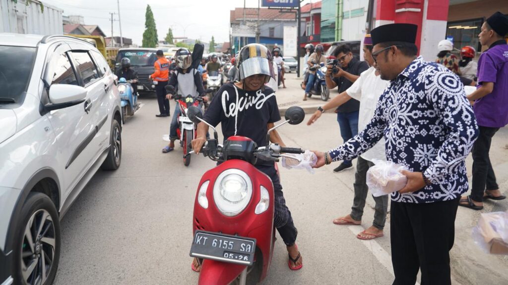 Momen Wabup Kasmidi bersam pengurus HIKMA Kutim membagikan ratusan takjik ke pengguna jalan. Foto: istimewa