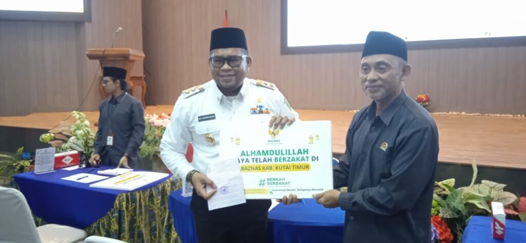 Bupati Kutim Ardiansyah Sulaiman dan Wabup Kasmidi Bulang dalam momen Kutim Berzakat gelaran Baznas. Foto: Yuni/Pro Kutim