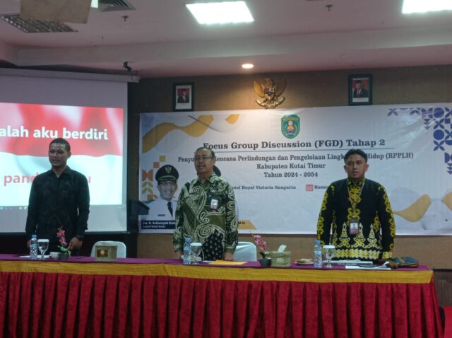 SANGATTTA – Pemkab Kutim melalui Dinas Lingkungan Hidup (DLH) dalam upaya menyusun masa depan lingkungan hidup yang berkelanjutan menggelar Focus Group Discussion (FGD) Tahap II sebagai bagian dari penyusunan Rencana Perlindungan dan Pengelolaan Lingkungan Hidup (RPPLH) Kabupaten Kutim Tahun 2024-2054. Kegiatan ini dibuka oleh Asisten Pemerintahan dan Kesejahteraan Rakyat (Pemkesra) Seskab Kutim Poniso Suryo Renggono di Pelangi Room Hotel Victoria, Kamis (25/7/2024).