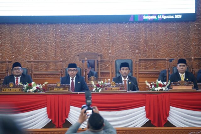 SANGATTA – Pada Rabu (14/8/2024), Gedung Sekretariat DPRD Kabupaten Kutai Timur (Kutim) dipenuhi nuansa haru sekaligus semangat, kala menggelar Rapat Paripurna untuk pengambilan sumpah Anggota DPRD Kutim periode 2024-2029. Bupati Kutim Ardiansyah Sulaiman, didampingi Wakil Bupati Kasmidi Bulang dan Ketua DPRD Kutim sementara Jimmi, hadir untuk menyampaikan arahan serta ucapan selamat kepada anggota dewan yang baru dilantik.