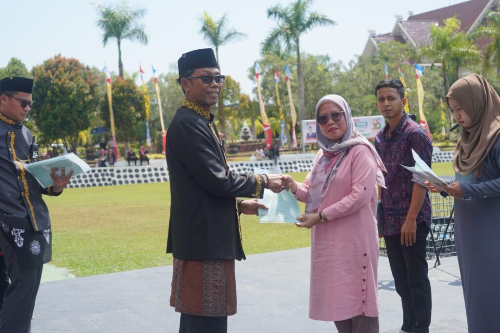 Pjs Bupati Kutim AHK menyerahkan penghargaan kepada para penerima di HUT ke-25 Kutim. Foto : Yuni/Pro Kutim