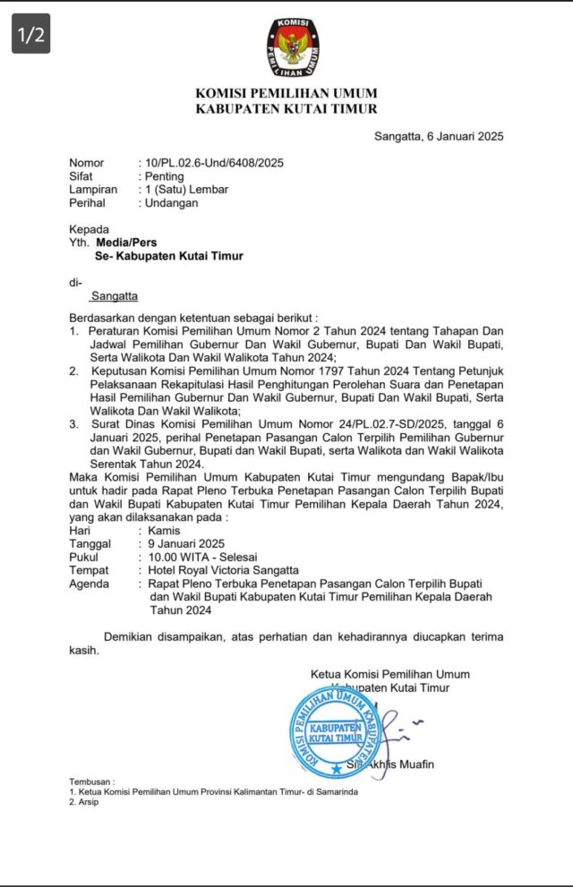 Undangan Rapat Pleno Terbuka Penetapan Pasangan Calon Terpilih Bupati dan Wakil Bupati Kabupaten Kutai Timur Tahun 2024.