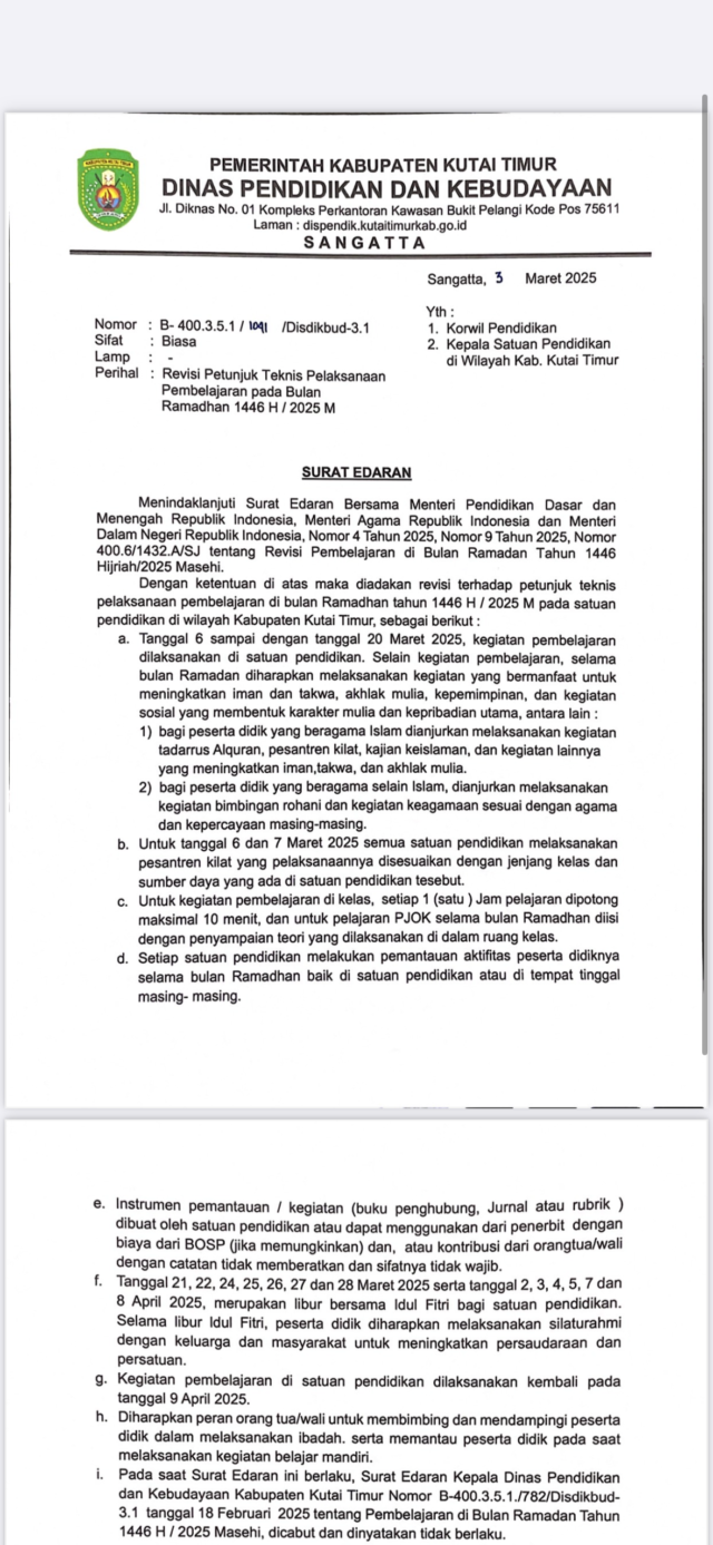 Kepala Disdikbud Kutim Mulyono, dalam Surat Edaran Nomor B-400.3.5.1/1041/Disdikbud-3.1, menetapkan bahwa pembelajaran di satuan pendidikan akan berlangsung mulai 6 hingga 20 Maret 2025, dengan beberapa penyesuaian.